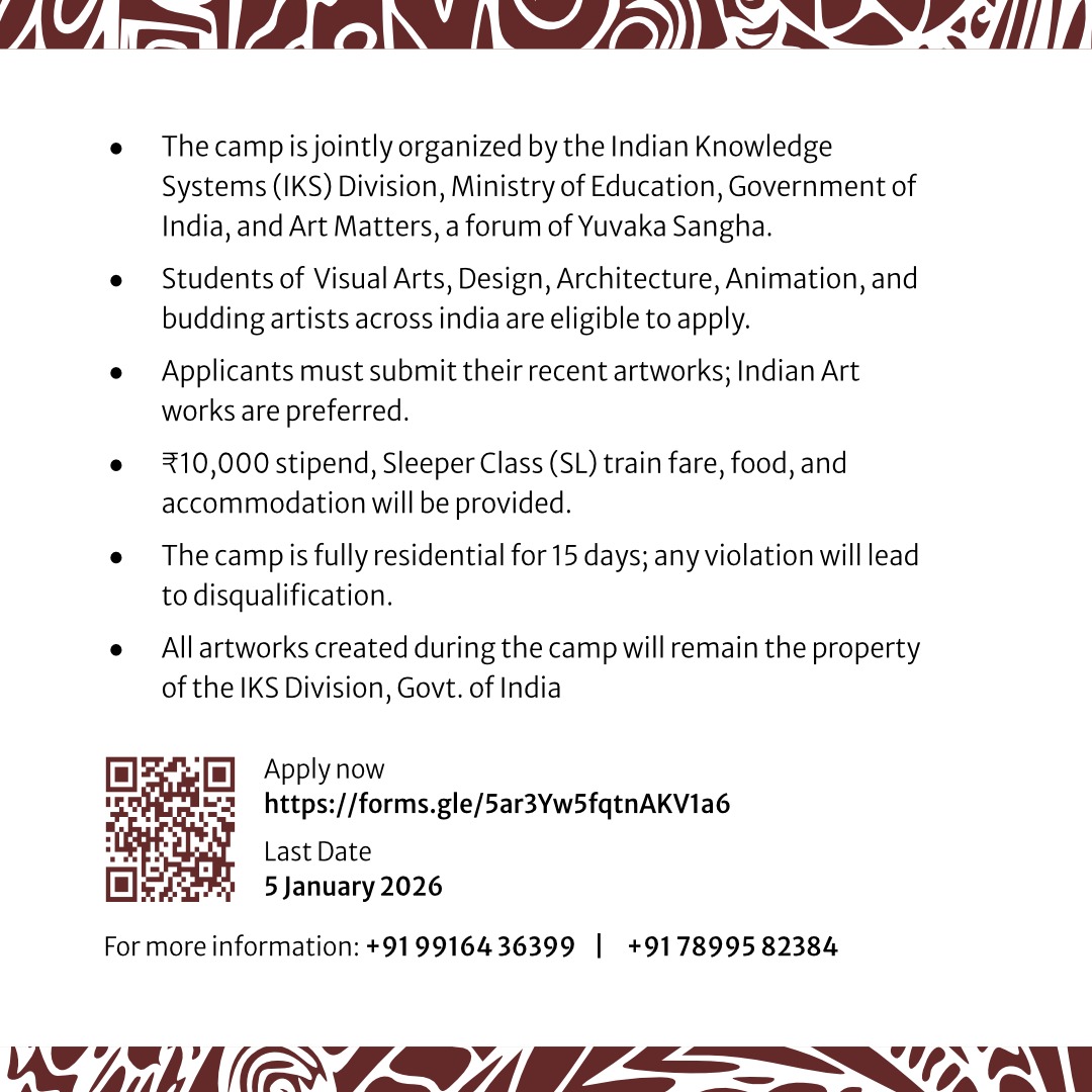 Yuvaka Sangha’s Art Matters Forum, in collaboration with the Indian Knowledge Systems (IKS) Division, Ministry of Education, Government of India, invites applications for a National Camp on Indian Art.